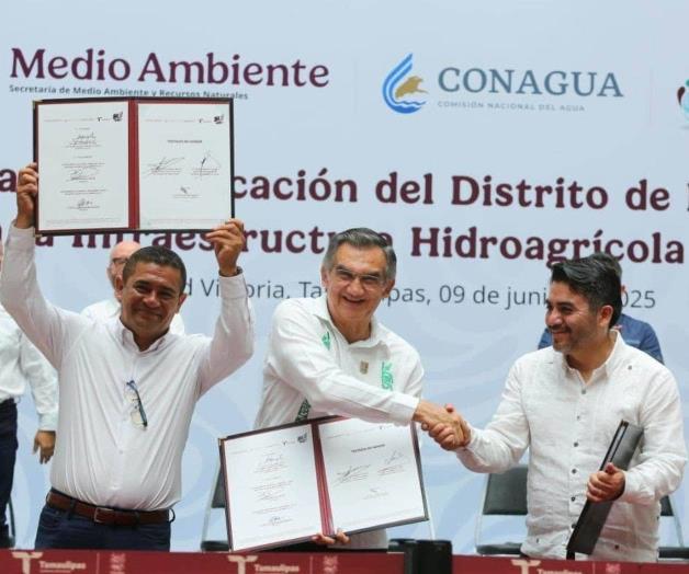 El gobernador Américo Villarreal Anaya y Efraín Morales López, director general de la Conagua, firmaron el Convenio para la Tecnificación del Distrito de Riego 025 Bajo Río Bravo y entregan recursos para infraestructura hidroagrícola en el estado